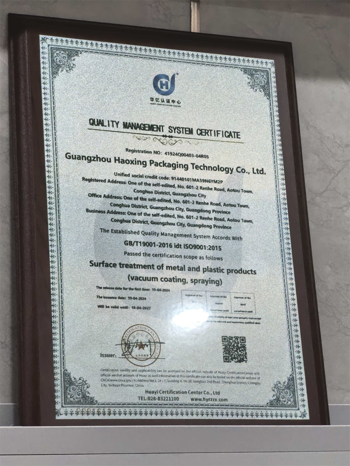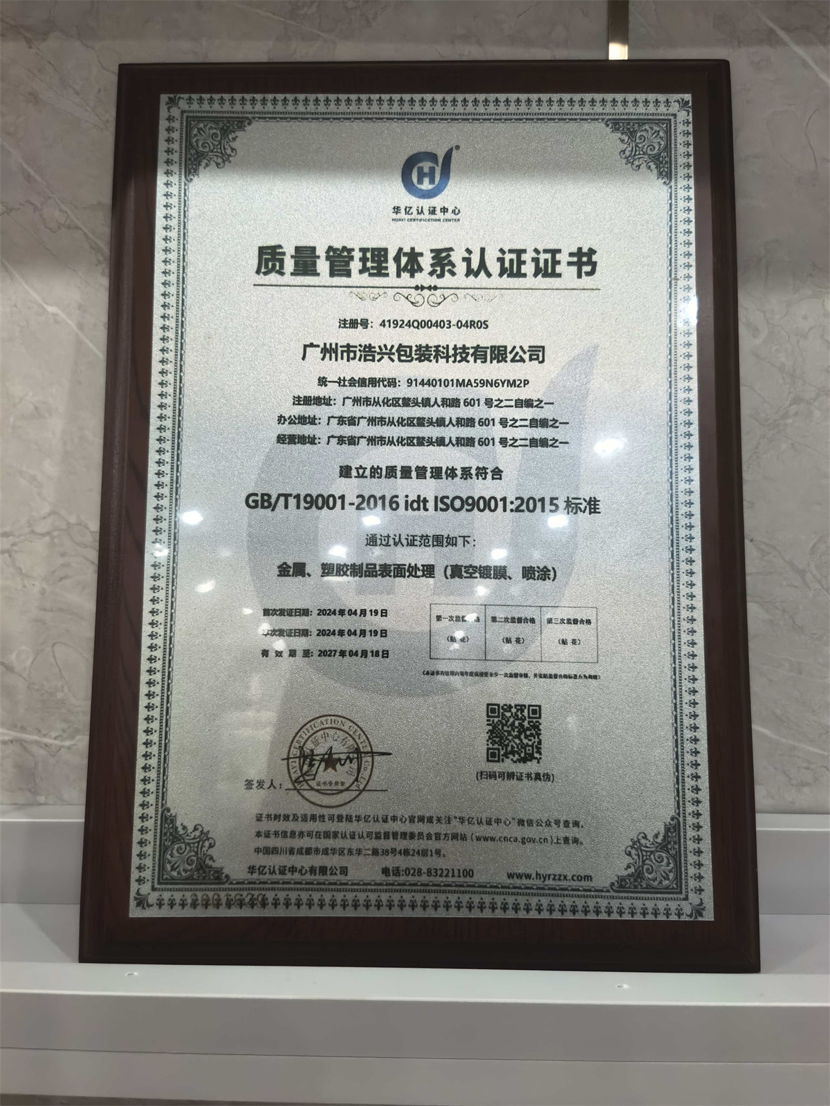 近日,广州市浩宇包装科技有限公司(以下简称"浩宇包装")正式通过ISO9001:2015质量管理体系认证(注册号:41934000403-041006),标志着该企业在金属、塑胶制品表面处理(真空镀膜、喷涂)等核心业务领域的质量管理水平已达到国际标准。